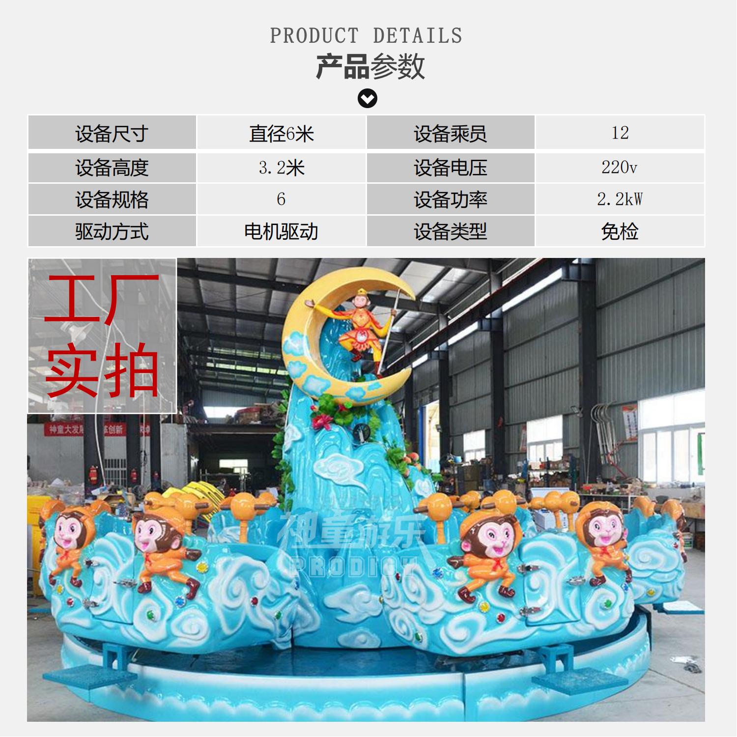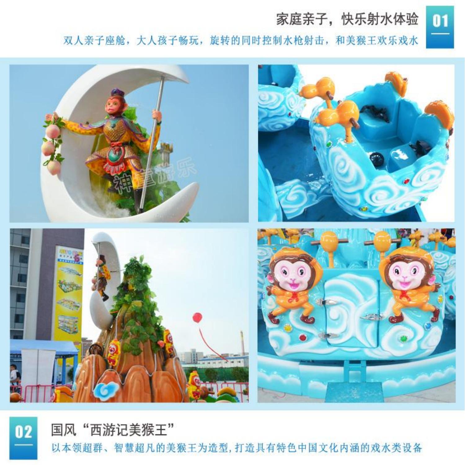 花果山猴王戲水是鄭州市神童游樂獨立研發 生產的專利機械噴水設備。獨特的外觀造型。每個座艙都有兩只可愛的小猴子。尤其是80后可以跟孩子講下自己的童年看過的電視,西游記,西游記大鬧天空 模擬西游記大鬧天官。讓小孩子拿著小水槍跟著齊天大圣大鬧天庭。