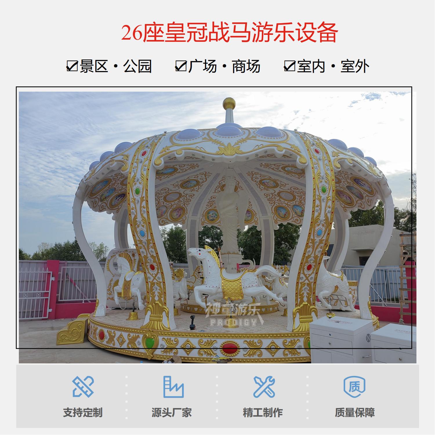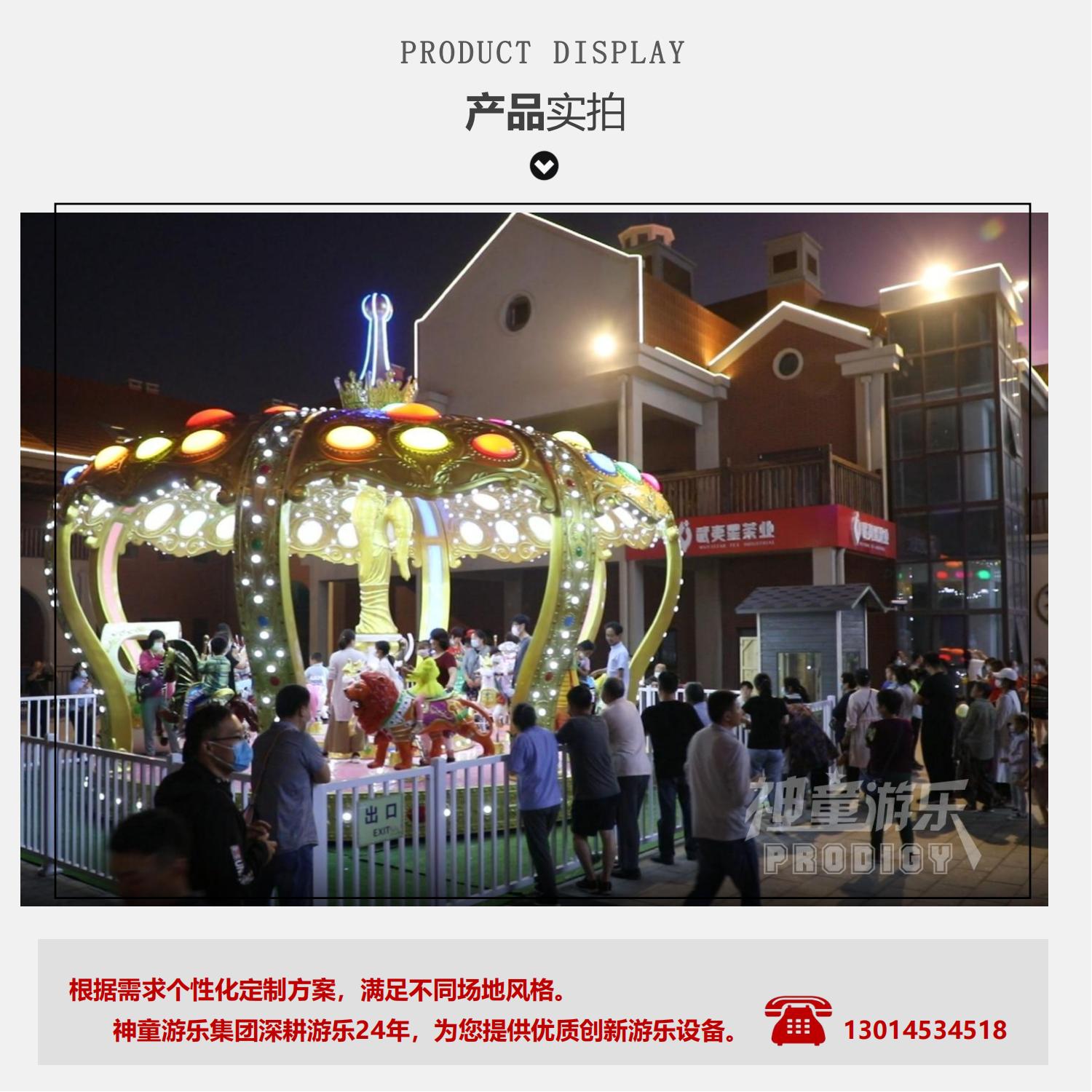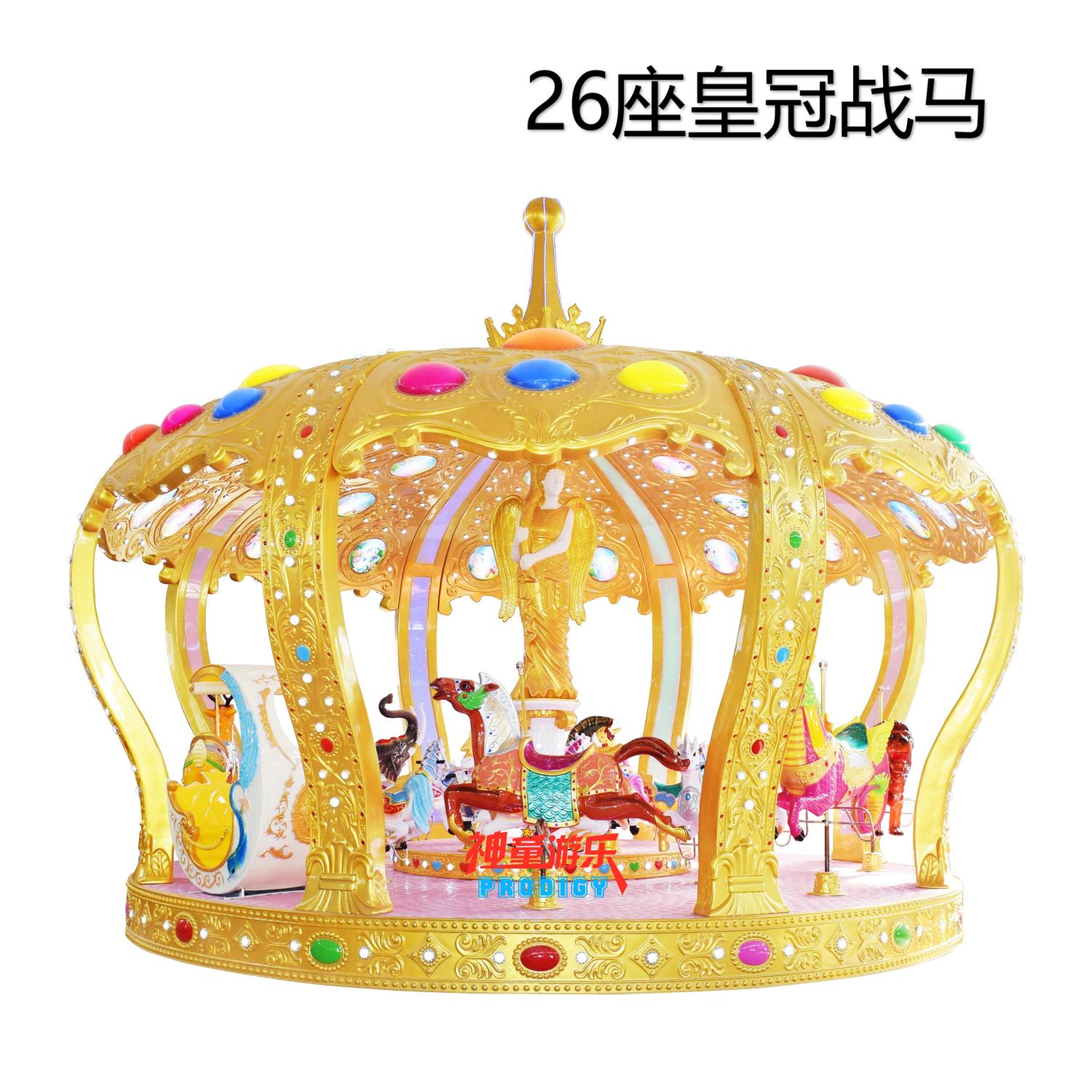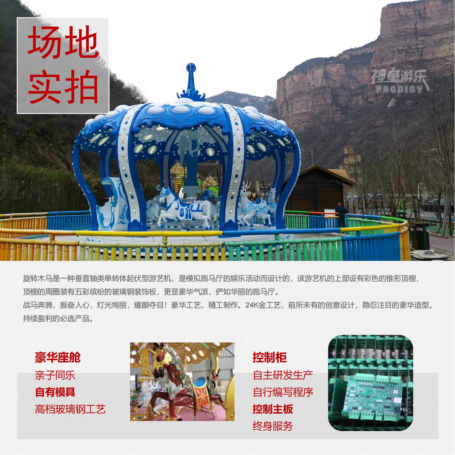 旋轉木馬是一種垂直軸類單轉體起伏型游藝機,是模擬跑馬廳的娛樂活動而設計的,該游藝機的上部設有彩色的錐形頂棚,頂棚的周圈裝有五彩繽紛的玻璃鋼裝飾板,更顯豪華氣派,儼如華麗的跑馬廳。戰馬奔騰,振奮人心,燈光絢麗,耀眼奪目!豪華工藝,精工制作。24K金工藝,前所未有的創意設計,隱忍注目的豪華造型。持續盈利的必選產品。