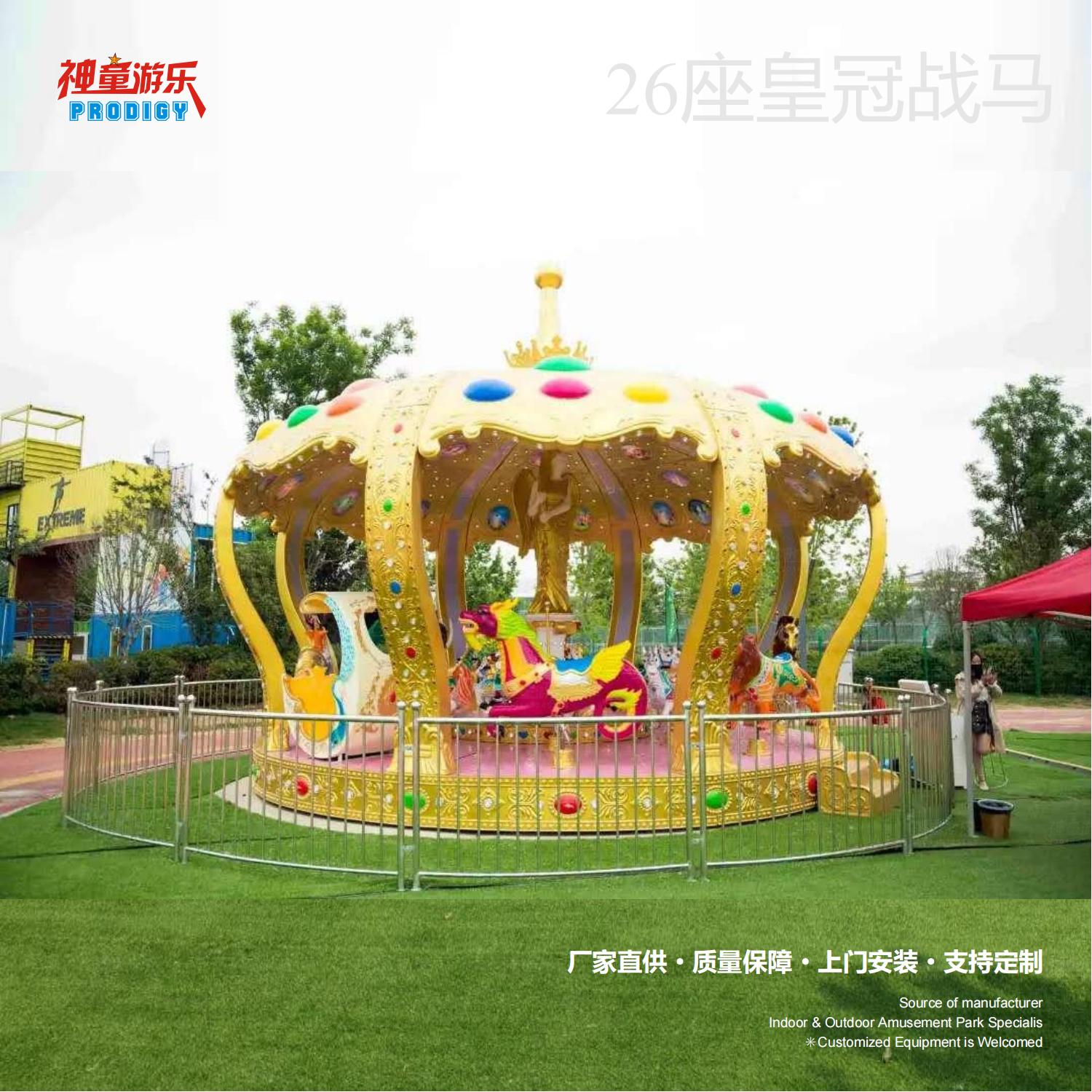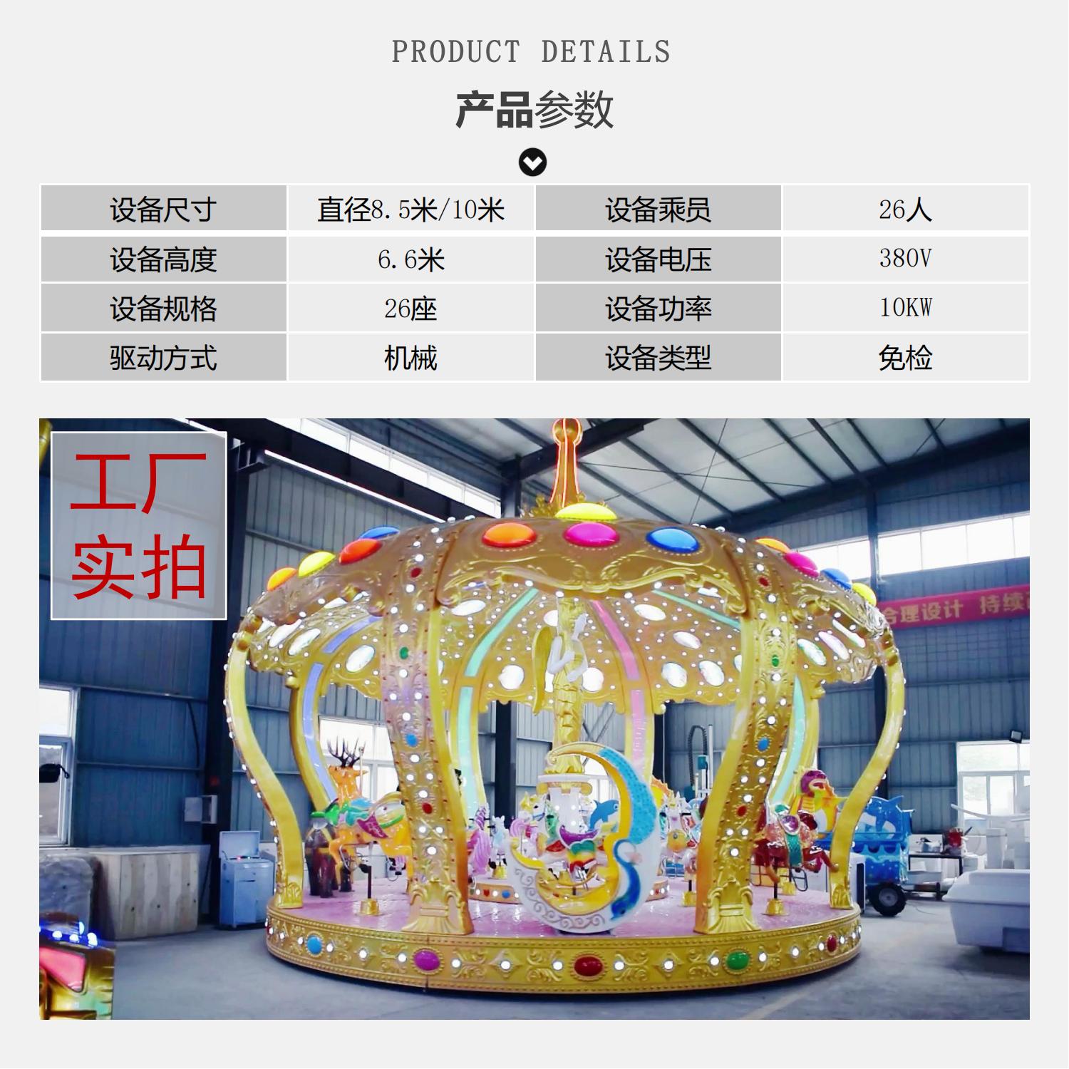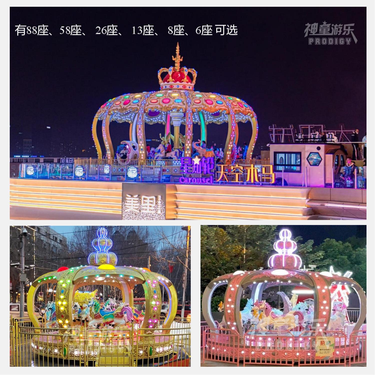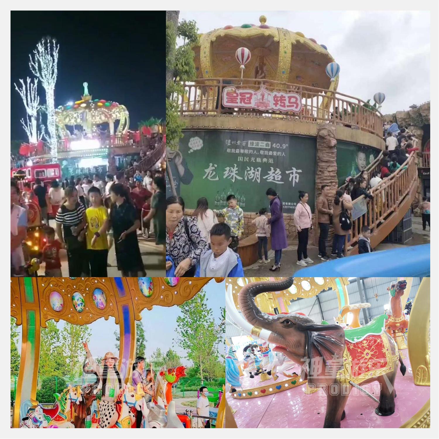 旋轉木馬是一種垂直軸類單轉體起伏型游藝機,是模擬跑馬廳的娛樂活動而設計的,該游藝機的上部設有彩色的錐形頂棚,頂棚的周圈裝有五彩繽紛的玻璃鋼裝飾板,更顯豪華氣派,儼如華麗的跑馬廳。戰馬奔騰,振奮人心,燈光絢麗,耀眼奪目!豪華工藝,精工制作。24K金工藝,前所未有的創意設計,隱忍注目的豪華造型。持續盈利的必選產品。