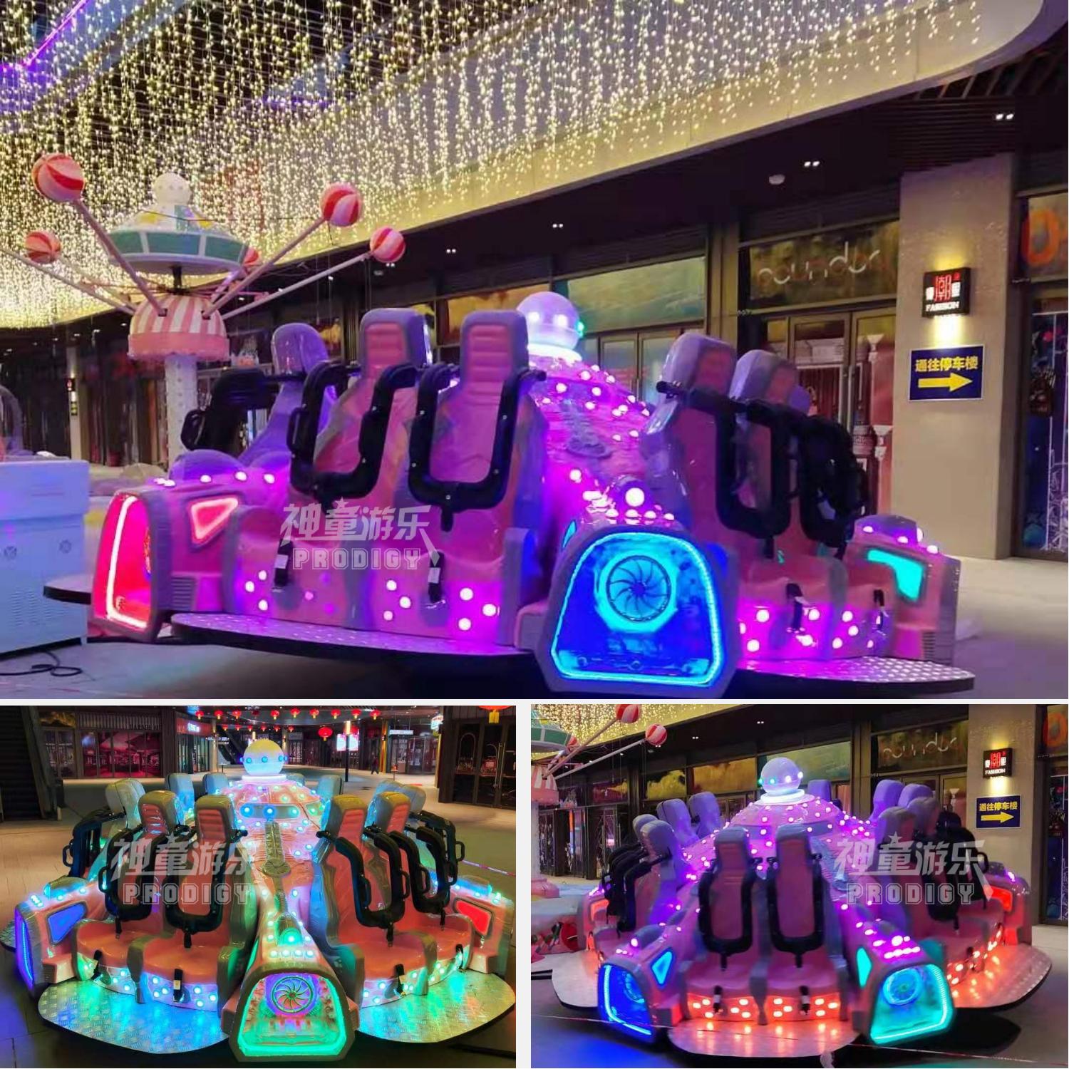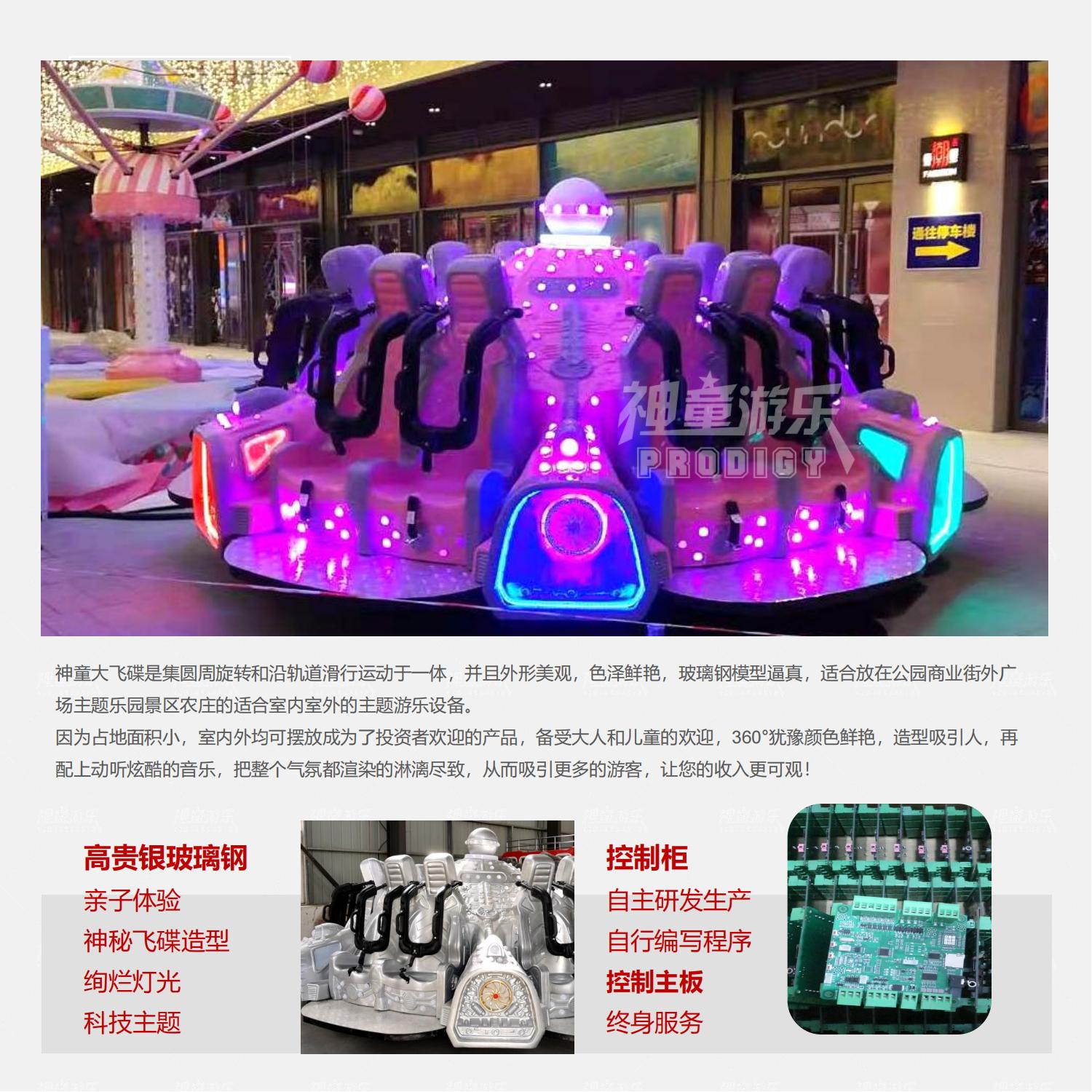 神童大飛碟是集圓周旋轉(zhuǎn)和沿軌道滑行運(yùn)動(dòng)于一體,并且外形美觀,色澤鮮艷,玻璃鋼模型逼真,適合放在公園商業(yè)街外廣場(chǎng)主題樂(lè)園景區(qū)農(nóng)莊的適合室內(nèi)室外的主題游樂(lè)設(shè)備。因?yàn)檎嫉孛娣e小,室內(nèi)外均可擺放成為了投資者歡迎的產(chǎn)品,備受大人和兒童的歡迎,360°猶豫顏色鮮艷,造型吸引人,再配上動(dòng)聽(tīng)炫酷的音樂(lè),把整個(gè)氣氛都渲染的淋漓盡致,從而吸引更多的游客,讓您的收入更可觀!